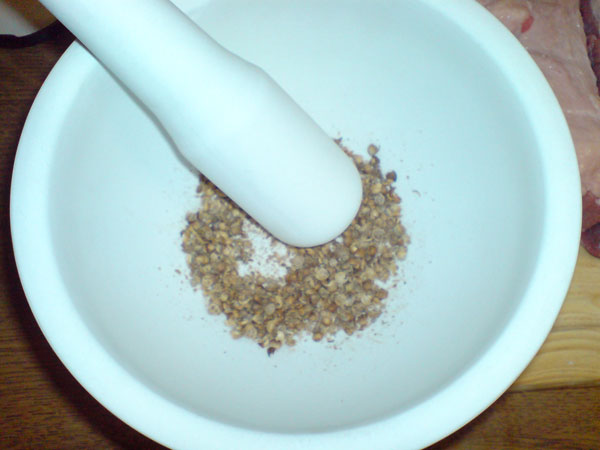 First of all, I bought a good half kilo of cheap meat. Brisket, being cheap and a little bit fatty, is perfect. By the careful, scientific method of 'slinging some in a bowl' I measured out a suitable amount of coriander and crushed it. The old, familiar scent should hit you at this stage and my resolve was once again tightened - I could already taste it!